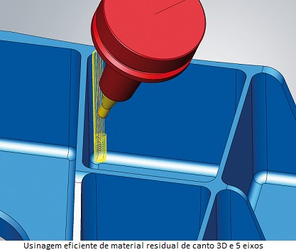 Segundo a empresa, a nova versão fornece uma abordagem inovadora para reduzir o material residual em cantos após tarefas de desbaste. As estratégias de usinagem de material residual de canto 3D e 5 eixos reúnem percursos de ferramenta de usinagem de material residual de nível Z em um processo ideal. “A usinagem de material residual 5 eixos torna possível a usinagem indexada de cantos de difícil alcance. Seleção de inclinação automática, movimentos de vinculação simultâneos e prevenção de colisões estão disponíveis nesse processo”, informa.