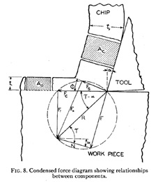 Para Merchant, após o leitor entender quais são as componentes de R e R’, é possível ler estas forças em um diagrama condensado no qual se considera o equilíbrio em um ponto exclusivo considerado usualmente na ponta da ferramenta de corte. Ou seja, a figura 8 é uma versão da figura 7 com o equilíbrio ocorrendo com a demonstração apenas de R.