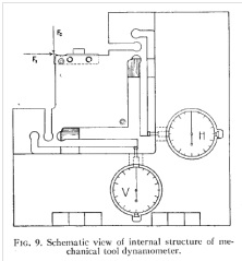 E a última sessão do texto original se concentra em explicar o experimento realizado por Merchant para validar as equações 9 a 16. É apresentado o esquema experimental, com especial atenção no dinâmometro mecânico para medir Fc e Ft. A figura 9 apresenta o dinamômetro e seu funcionamento é imediatamente suposto: o Castelo porta-ferramenta está apoiado sobre vigas com comportamento mecânico à deformação conhecido. Isto significa que ao realizar a usinagem, os relógios apalpadores vão indicar a quantidade de deformação que as vigas internas sofreram, e com isto é possível conhecer as componentes de força Fc e Ft.