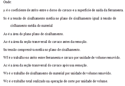 E as componentes de força que resultam em R são Fs e Fn, ou Ft e Fc. Fs é a força de cisalhamento no plano de cisalhamento, enquanto Fn é a força normal exercida no ponto considerado ortogonal ao plano de cisalhamento. Ft é a componente perpendicular à direção de corte.