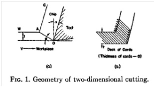 Assim como a resenha anterior de Lee e Schaffer, novamente o tema plasticidade tem importância central, mas agora é explicito que o autor considera de sumária importância o pequeno intervalo de tempo para ocorrer a deformação plástica. Desta forma, uma análise que é parcialmente teórica sobre o campo de tensões no cavaco e na peça, além de considerações da energia de deformação são consideradas de grande valor na descrição daquilo que “provavelmente” ocorre quando metal é cortado por usinagem.