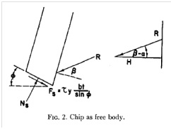 Assim como ocorre em qualquer análise dinâmica, um diagrama de corpo livre visto na figura indica a força R exercida sobre o cavaco (ver figura 2). A inclinação de R em relação à superfície de saída da ferramenta indica a existência de um ângulo de atrito (b), assumido como contanto ao longo do escoamento.