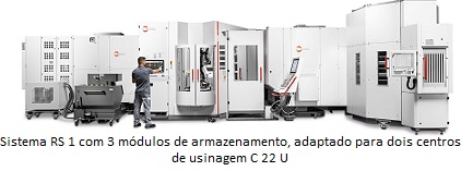 O RS 1 trabalha com diferentes centros de usinagem Hermle: C 12, C 22, C 250, C 32, C 400 ou C 42. No caso de duas máquinas conectadas (não precisam ser de modelos iguais), uma delas é controlada por meio do sistema de controle e automação HACS ou pelo sistema de orientação da produção SOFLEX. No caso de duas máquinas, o controle é feito via SOFLEX e elas podem operar de forma autônoma.