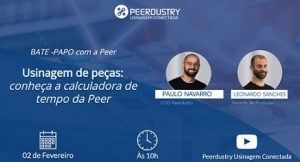 (30/01/2022) – No dia 2 de fevereiro, às 10h, a Peerdustry vai realizar o ‘4º Bate-Papo com a Peer’ sob o tema “Usinagem de peças: conheça a calculadora de tempo da Peer”. Paulo Navarro e Leonardo Sanchez, respectivamente diretor de Operações e gerente de Produção da Peer, vão apresentar a nova ferramenta desenvolvida para o mercado de usinagem.