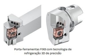 PORTA-FERRAMENTAS – O porta-ferramentas FIX8 possui tecnologia de refrigeração 3D de precisão, fornecendo líquido refrigerante suficiente precisamente onde é necessário. Três bicos de líquido refrigerante são direcionados para a face de corte, controlando a temperatura, a evacuação de cavaco e suportando a formação de cavaco. Os orifícios de saída do líquido refrigerante em dois locais diferentes são direcionados para o flanco do inserto, controlando o calor na zona de corte e prolongando a vida útil da ferramenta.