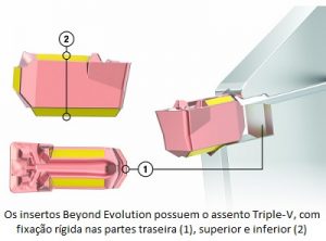 Todos os modelos de insertos Beyond Evolution possuem o assento Triple-V: fixação rígida nas partes traseira, superior e inferior, garantindo o máximo de estabilidade, especialmente durante trabalhos de torneamento e criação de perfis multidirecionais.