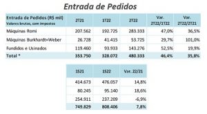 Boa parte desse desempenho se deu na Unidade de Máquinas, que apresentou crescimento de 36,5% em relação ao 2º trimestre de 2021 e de 47% em relação ao 1º trimestre de 2022. Na comparação semestral a alta é de 14,8%. “Em maio de 2022, houve o retorno presencial da maior feira de máquinas e equipamentos da América Latina, a Feimec. O número de expositores e visitantes excedeu as expectativas e o volume de negócios também demonstrou o bom momento vivido pela indústria em geral, o que impactou positivamente no crescimento da entrada de pedidos da Unidade de Máquinas Romi no 2T22”, informa a empresa no relatório do balanço.