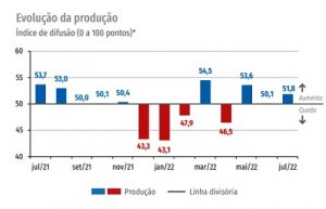 (21/08/2022) – De acordo com a última Sondagem Industrial, publicada pela CNI – Confederação Nacional da Indústria, em julho a produção industrial alcançou 51,8 pontos. Geralmente, o valor médio para os meses de julho é de 51,2 pontos, o que aponta o aumento do ritmo da produção acima da média neste ano.