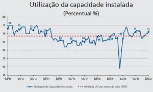 A Utilização da Capacidade Instalada variou 1% em julho, chegando a 71%, o maior volume registrado até o momento em 2022. Segundo a CNI, o resultado supera o percentual médio dos meses de julho desde o inicio da série histórica, de 69%, em 2011.