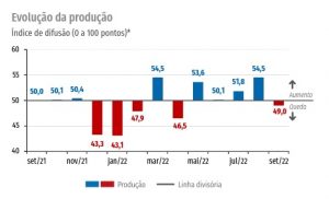 (23/10/2022) – Sondagem da Confederação Nacional da Indústria (CNI) mostra que a produção industrial brasileira caiu de 54,5 pontos em agosto para 49 pontos em setembro, depois de quatro meses de altas consecutivas.