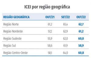 No mesmo período, o ICEI caiu de 61,9 pontos para 58,9 pontos no Sul, de 62 pontos para 60 pontos no Sudeste e 65,4 pontos para 62,7 pontos no Norte.
