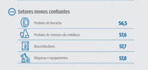 Restaram como os setores menos confiantes de setembro para outubro o de produtos de borracha (56,5 pontos), produtos de minerais não metálicos (57,6) e o de biocombustíveis (57,7).