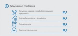 Já os mais confiantes foram o de manutenção, reparação e instalação de máquinas e equipamentos (65,7), produtos farmoquímicos e farmacêuticos (64,7) e produtos de metal (62,9).