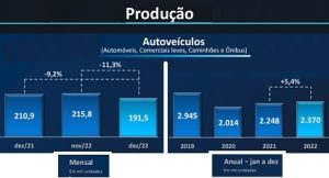 Com as 191,5 mil unidades que deixaram as linhas de montagem em dezembro, o ano fechou com 2,37 milhões de unidades produzidas, alta de 5,4% sobre 2021. Segundo a entidade, contribuiu para este resultado a sensível redução das paralisações de fábricas no segundo semestre, com uma melhora parcial no fluxo de componentes eletrônicos.
