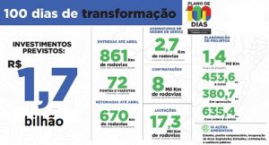 (29/01/2023) – O Ministério dos Transportes apresentou no último dia 18 de janeiro o Plano de 100 Dias com as ações prioritárias do Governo Federal, por meio do Ministério dos Transportes, para os setores rodoviário e ferroviário terá cerca de R$ 1,7 bilhão para retomar e intensificar obras, preparar rodovias para o período de chuvas, garantir o escoamento da safra agrícola e diminuir o número de acidentes graves.