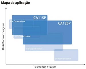 De acordo com a empresa, o CA125P é a primeira recomendação para usinagem de aço, pois possibilita alta versatilidade, desde corte contínuo até altamente interrompido. Enquanto o CA115P proporciona alta eficiência com resistência ao desgaste e ao lascamento, possibilitando o uso em usinagem de corte contínuo até levemente interrompido.