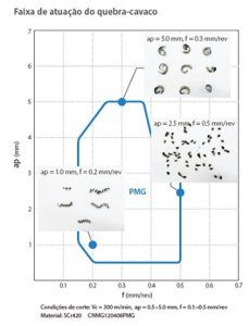 Os insertos classe CA115P/CA125P, quando combinados com o novo quebra-cavaco PMG, em operações de média remoção a desbaste, possibilitam uma vida útil da ferramenta de até 4 vezes maior. A estrutura do quebra-cavaco em degraus suprime o emaranhamento de cavacos durante a usinagem de grandes profundidades de corte e seu ponto em círculo garante o controle de cavacos em usinagem de pequenas profundidades de corte possibilitando, assim, sua aplicação nas faixas de ap = 0,5 ~ 5,0 e f = 0,1 ~ 0,5 mm/rev.