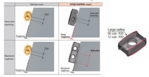 Algumas das características: as arestas de corte possuem um contato maior, facilitando a usinagem e aumentando com isso a vida útil da aresta; ideal para usinagem de materiais de difícil usinabilidade, como ligas de titânio, inconel e aço inoxidável.