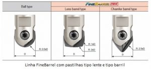 No exemplo acima podemos observar as geometrias e seus raios num conceito “barril” (para usinagem de superfícies mais verticais) e conceito “lente” (para usinagem de superfícies mais horizontais), tornando a usinagem mais rápida, segura e de qualidade.