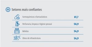 Dois setores se destacaram pelo alto aumento na confiança. No Farmoquímicos e farmacêuticos o ICEI passou de 54,9 para 61,7 e Equipamentos de informática, eletrônicos e ópticos, que subiu de 46,0 para 50,1. O indicador varia de 0 a 100, valores acima de 50 pontos indicam confiança do empresário.