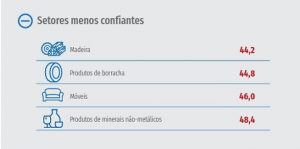 Os setores menos confiantes da economia são, com ICEI abaixo dos 50 pontos: Madeira, Produtos de Borracha, Móveis e Produtos de minerais não-metálicos.