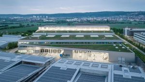 Painéis fotovoltáicos nos telhados dos edifícios da Trumpf. Produções que consomem muita eletricidade devem ser executados quando a energia renovável está disponível