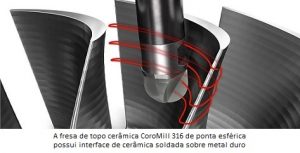 A fresa de topo de cabeça intercambiável CoroMill 316 de cerâmica soldada para operações de desbaste é uma solução produtiva para aplicações de motores aeroespaciais em materiais ISO S. Em primeira instância, o conceito de cabeça intercambiável facilita a flexibilidade inerente ao processo. Também está disponível uma versão de seis canais com raio de canto reto que proporciona operações de fresamento lateral produtivas e uma versão de quatro canais desenhada para impulsionar o faceamento, graças a sua geometria de face de alto avanço.