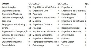O curso de Administração foi o mais mencionado, com 75 brasileiros indicando graduação na área, seguida de Engenharia Elétrica (31) e Engenharia Mecânica (28). No total, porém, são mais de 15 tipos de engenharias identificadas pela pesquisa, sendo a área de conhecimento mais frequentemente citada.