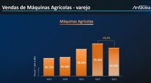 (03/03/2024) – O Brasil vendeu 60.981 mil máquinas agrícolas em 2023, uma queda de 13,2% na comparação com 2022, quando foram comercializadas 70.262 mil unidades.
