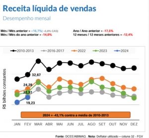 Segundo a entidade, as receitas de vendas de máquinas no mercado doméstico vêm registrando retração contínua desde o ano de 2022. Em 2022 a queda foi de 6,9%, em 2023 de 15,4%. Em 2024, o primeiro bimestre do ano registrou queda de 18% em relação ao mesmo período de 2023 que já tinha sido baixo. Com esse resultado, as receitas de vendas no mercado interno retornaram ao nível da crise fiscal de 2016– 2017.