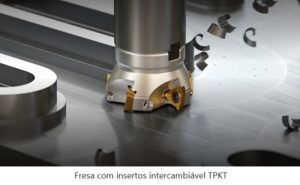 Já a TPKT é uma fresa intercambiável de ângulo de ataque de 90 graus para a usinagem de cantos. Seu diferencial, segundo o gerente, são as três arestas de cortes positivas, o que proporciona excelente acabamento superficial. “Essa é uma fresa com opções várias opções de geometrias, quebra-cavacos e classes que possibilitam usinar aços endurecidos, inox, ferro fundido, alumínio e superligas”, completa.