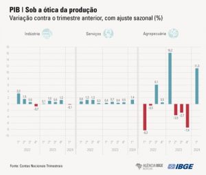 Na comparação do primeiro trimestre de 2024 com o mesmo trimestre do ano passado, houve alta de 2,5% no PIB, puxada também pelos Serviços e pelas atividades de Informação e Comunicação, Comércio e Outras Atividades de Serviços.