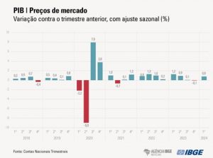 (09/06/2024) – O Produto Interno Bruto (PIB) do país teve alta de 0,8% no primeiro trimestre de 2024, frente ao último trimestre de 2023, na série com ajuste sazonal.