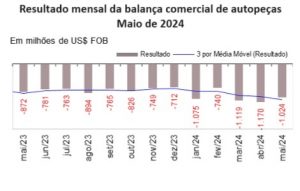 O Sindipeças destaca: “Convém notar que a variação acumulada das exportações em 2024 prossegue em escala negativa à ordem de dois dígitos. Por seu turno, as importações seguem avançando, com variação média até maio à ordem de 4,0% a 5,0% de crescimento”.