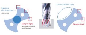 A margem tripla oferece excelente precisão de usinagem. Três segmentos de margens dão suporte ao furo e guiam a usinagem para maior estabilidade. E alta rigidez com espessura do núcleo ideal.