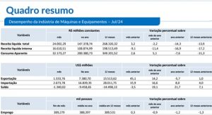 Segundo a entidade, “o mês de julho de 2024 registrou continuidade da recuperação nas atividades medidas pelas receitas líquidas de vendas de máquinas e equipamentos, desta vez puxada pela melhora das vendas no mercado externo”.