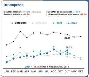 No mercado doméstico, a receita somou R$ 18,4 bilhões, superando em 12% o resultado do mês anterior e em 6,5% o de outubro de 2023. Já as exportações totalizaram US$ 1,40 bilhão, atingindo o melhor resultado do ano nas vendas externas, ficando 8,2% acima do mês anterior e apenas 0,6% abaixo do alcançado em outubro de 2023.