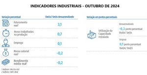 Mercado de Trabalho – O emprego industrial ficou praticamente estável, ao aumentar 0,1% em outubro. Trata-se do 13º mês consecutivo sem recuo no índice que mede a criação de postos de trabalho pela indústria. Nos dez primeiros meses de 2024, o emprego no setor acumula alta de 2,1%, em relação ao mesmo período do ano passado.