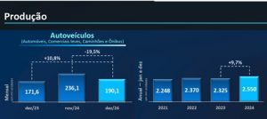 (26/01/2025) – Levantamento da Associação Nacional dos Fabricantes de Veículos Automotores (Anfavea) mostra que a produção de veículos no país somou 2,550 milhões em 2024, representando alta de 9,7% na comparação com 2023.