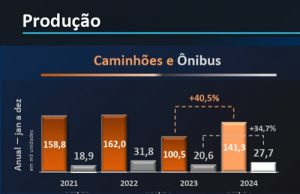 Cautela – No entanto, as projeções da entidade para o segmento de pesados em 2025 são, no mínimo, cautelosas. Para a associação, as fabricantes deverão produzir não mais do que 169,4 mil caminhões e ônibus em 2025, apenas 0,2% a mais do que os 169 mil de 2024.