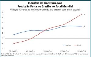 Já do ponto de vista regional, o maior destaque positivo coube à indústria de transformação da América Latina e Caribe, puxada pelo Brasil, que, após quatro quedas consecutivas, aumentou sua produção em +1,7% entre o segundo e o terceiro trimestre de 2024, ocupando a liderança da expansão industrial mundial neste último trimestre.