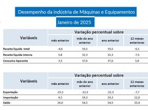 (02/03/2025) – Após três anos de resultados negativos, o setor de máquinas e equipamentos pode, enfim, voltar a registrar um desempenho positivo em 2025. O setor fechou o primeiro mês do ano com aumento das receitas de 19,5%, na comparação com o mesmo mês de 2024. Melhor ainda foi o resultado das vendas no mercado doméstico: +32,3%.