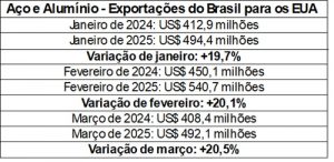 Em coletiva de imprensa para detalhar os resultados de março da balança comercial, o diretor de Estatísticas e Estudos de Comércio Exterior do MDIC, Herlon Brandão, afirmou que, no caso do aço e alumínio, pode ter havido um “embarque antecipado”. O resultado é que os números apresentam aumento de 23,9%, em relação ao mesmo mês do ano passado, nos envios aos EUA.