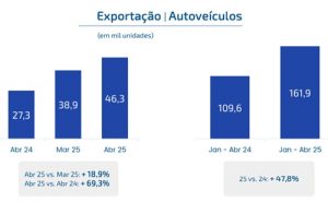 EXPORTAÇÕES – O indicador mais animador para o setor foi o das exportações. As 46,3 mil unidades embarcadas representaram crescimento de 18,9% em relação a março. No acumulado do ano, o volume de 161,9 mil unidades é 47,8% superior ao do primeiro quadrimestre de 2024.