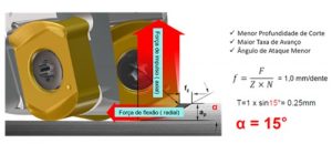 Com o que referimos acima é possível dizer que com ângulos menores que 90° podemos ajustar o avanço recomendado por catálogo, atingindo maior taxa de avanço pela compensação, resultando no fator principal: “Produtividade”.