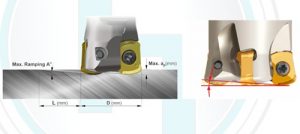Características: Insertos com 10 arestas; Ângulo de saída positivo; Dois tamanhos de pastilhas 05&10; Aresta de corte em hélice; Mesma pastilha para faceamento e alto-avanço; Fresas com canal de refrigeração.