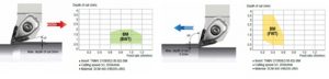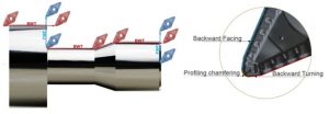 Capacidade de Torneamento Bidirecional: Uma das características mais notáveis da linha TurnSfeed é a sua capacidade de realizar torneamento contínuo bidirecional (tanto para a esquerda quanto para a direita em alto avanço) usando um único tipo de porta-ferramentas neutro sem a necessidade de reposicionamento da ferramenta, permitindo um aproveitamento do curso de usinagem sem movimentos em G0 para posicionar e iniciar a usinagem, ou seja, mergulha na peça e segue torneando me alto avanço conforme ilustração abaixo.