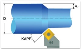 A chave para essa abordagem aparentemente contraintuitiva reside no efeito de redução da espessura do cavaco. Quando Xr entra no material em um ângulo muito pequeno em relação ao eixo de rotação da peça, a espessura real do cavaco se torna significativamente menor seguido pela fórmula h=f_n . sen.Xr, e com isso, é necessário compensar no avanço por rotação.