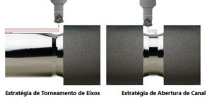 Isso é alcançado através de características como: Torneamento alto avanço (BWT) e convencional (FWT). Para a estratégia (BWT) utiliza ângulos de posição pequenos, permitindo maior taxa de avanço linear. Já para o torneamento convencional (FWT), focado no acabamento, a linha conta com um ângulo otimizado que garante a precisão e rugosidade necessária conforme ilustra abaixo.
