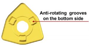 Design Anti-Rotacional: Os insertos possuem ranhuras na parte inferior e um sistema de fixação por parafuso robusto, que garante uma fixação extremamente estável e impede a rotação do inserto durante a usinagem agressiva.
